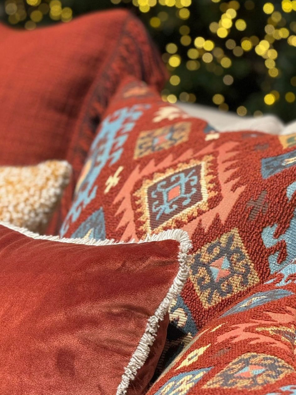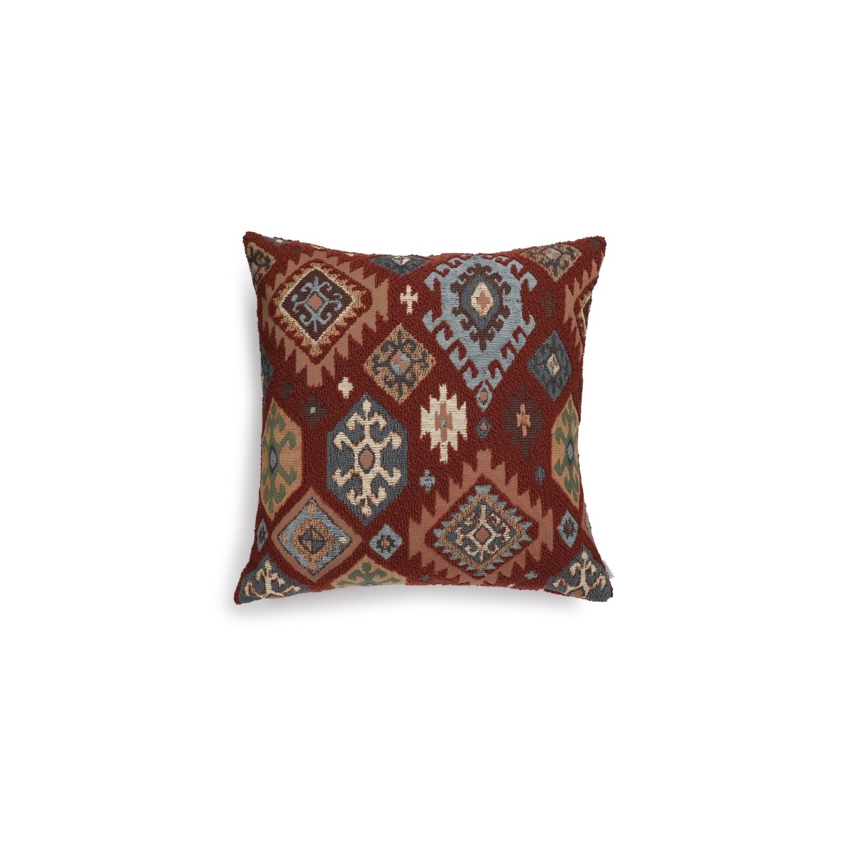 Scapa Home vierkant sierkussen ‘Amber’ met etnisch patroon in bordeaux, zalm, blauw en off-white 60 x 60 cm